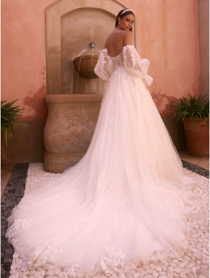 Ivoorwitte bruidsjurk met kanten top en losse mouwen.