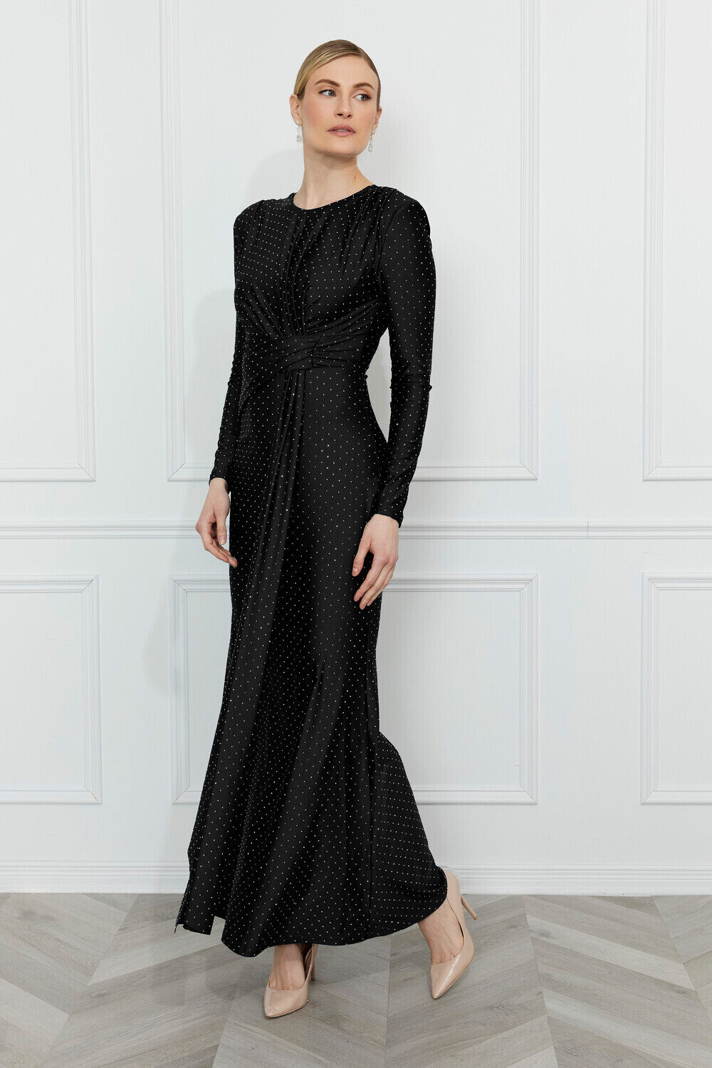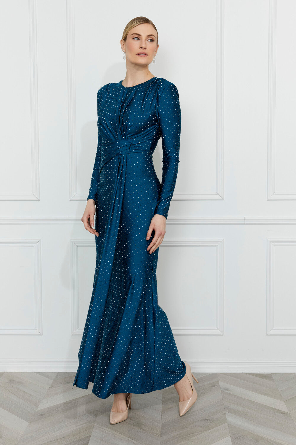 Peacock kleurige lange stretch jurk met lange mouw. De jurk is bezaaid met zilveren glitters.