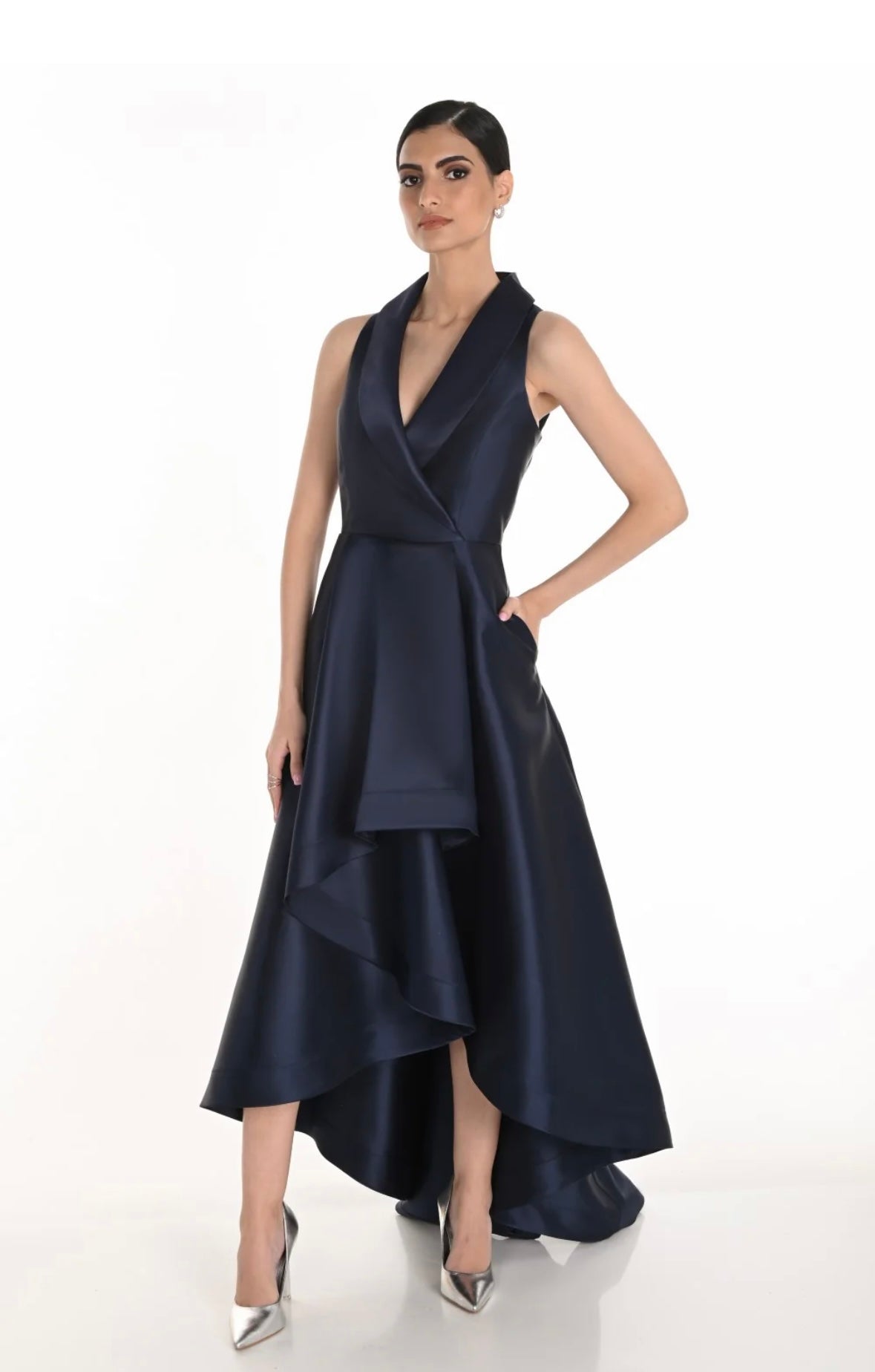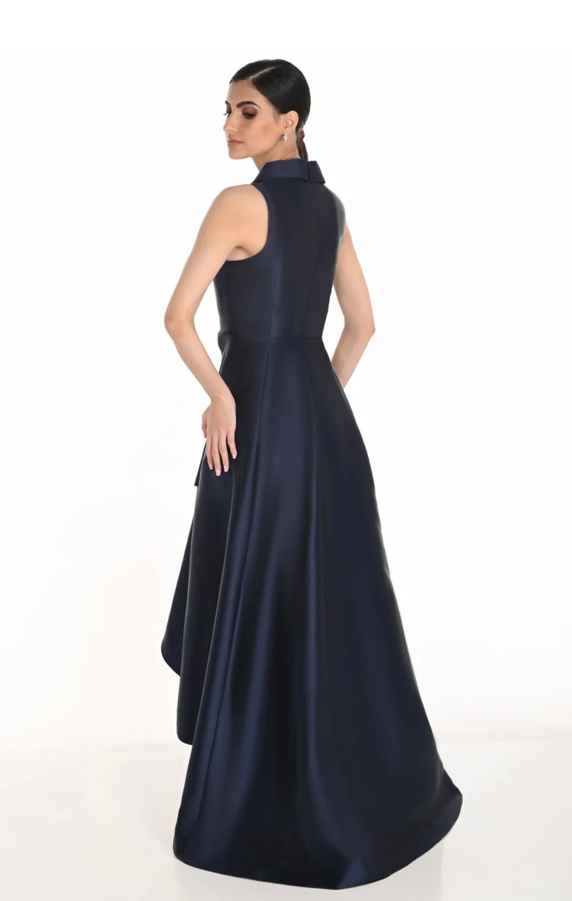 Blauwe zijden jurk waar de voorkante korter is dan de achterkant. De jurk heeft een mooie kraag.