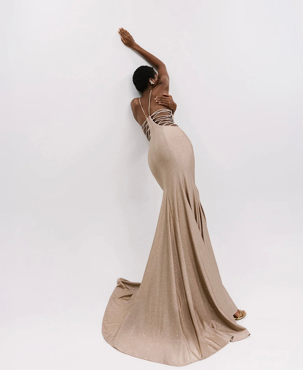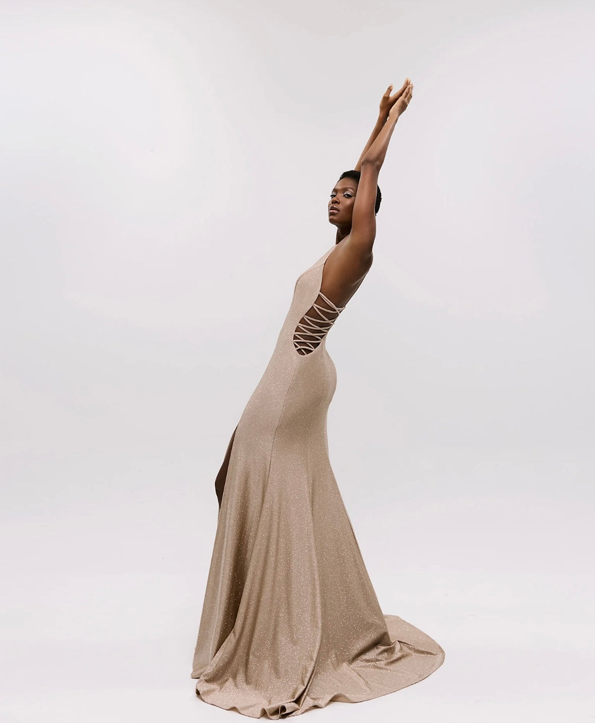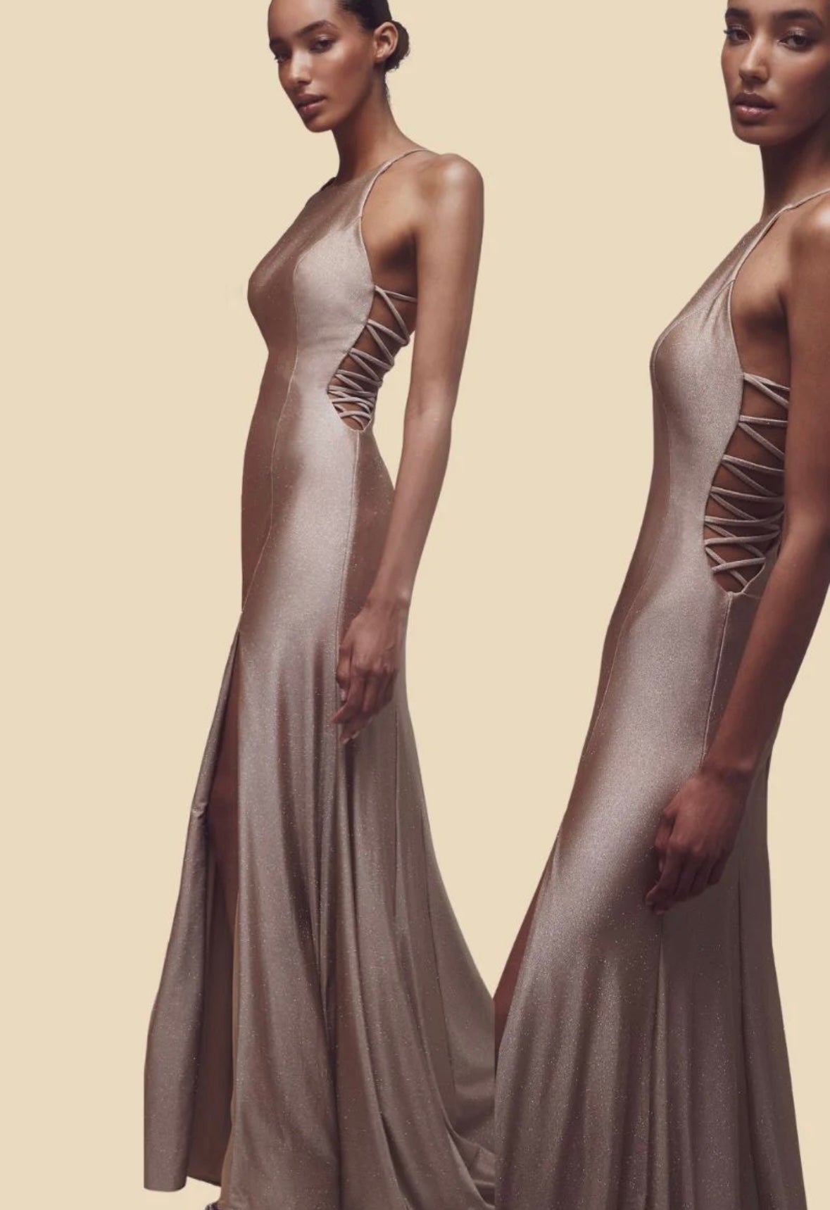 Beige lange jurk met open zijkanten. De jurk heeft een sleep en de jurk is er ook in de kleur zwart.