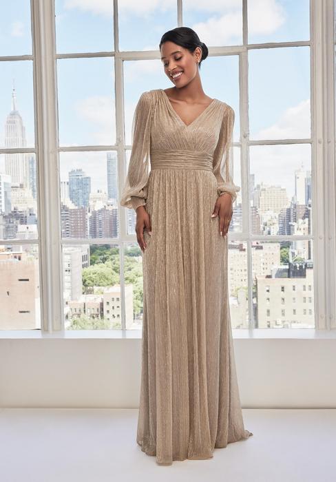 Gouden lange jurk met fijne glitter in de stof. De jurk heeft een lange mouw en v-halslijn.