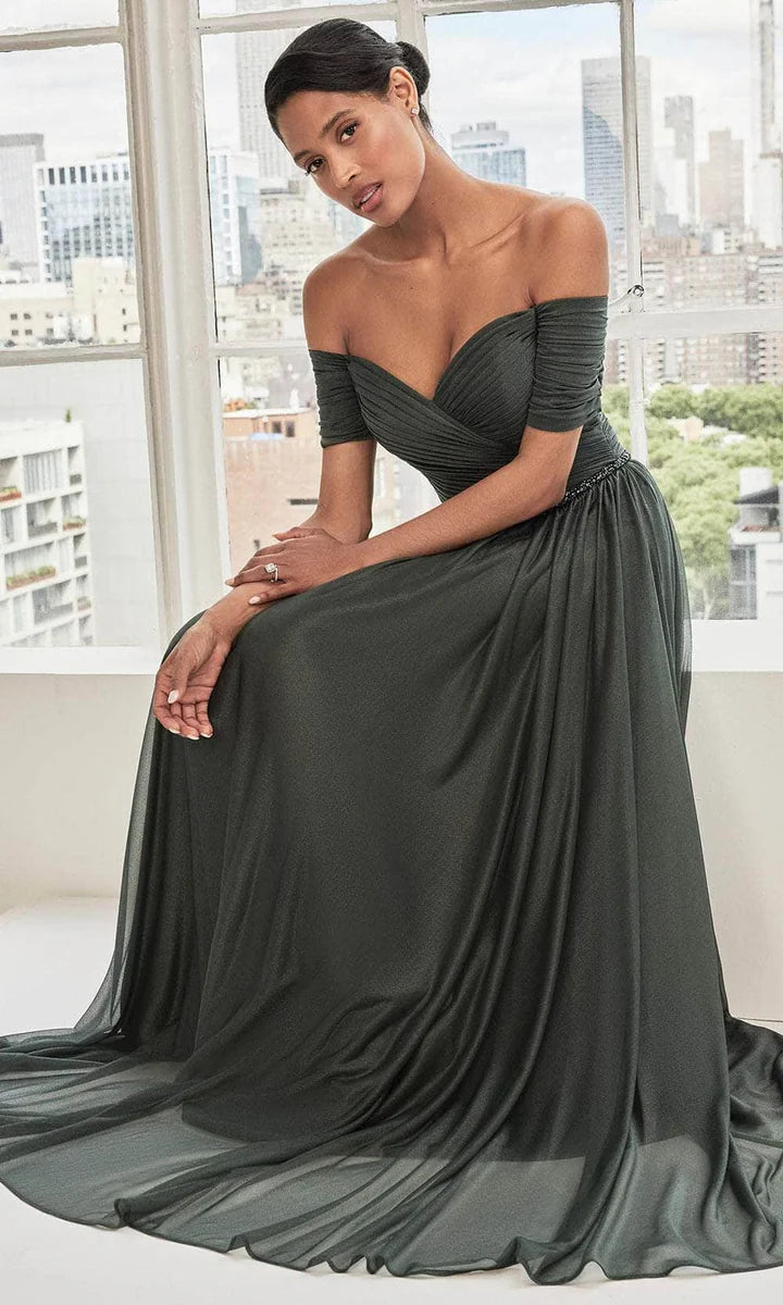 Groene lange jurk van chiffon. De jurk is off shoulder en heeft een zwierige rok.