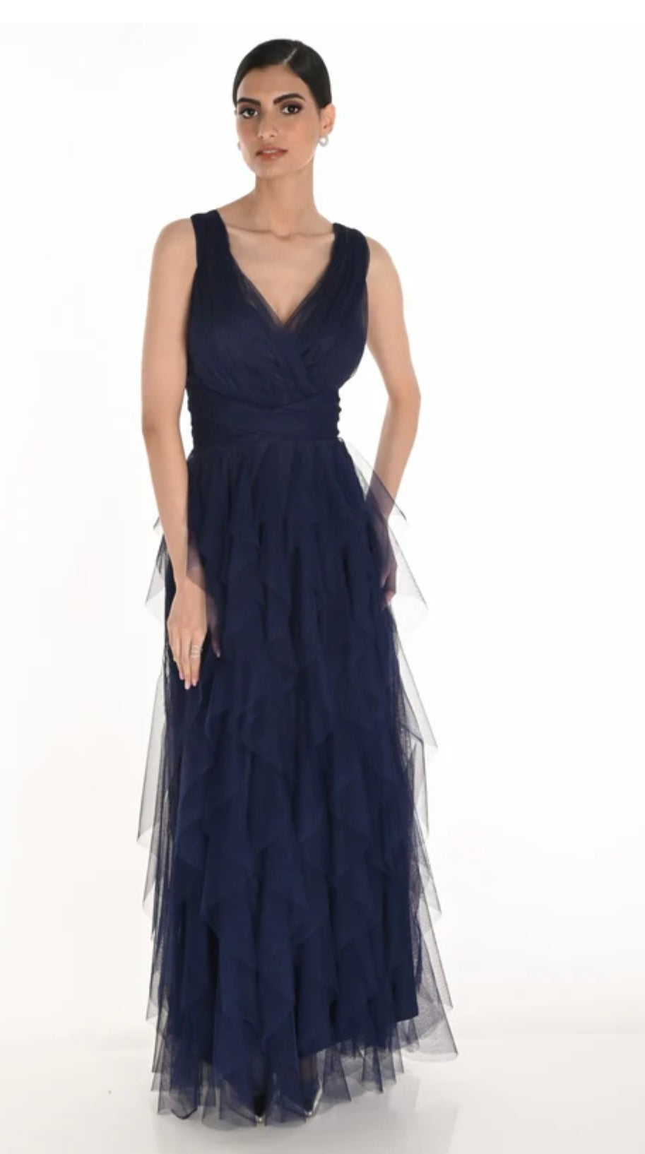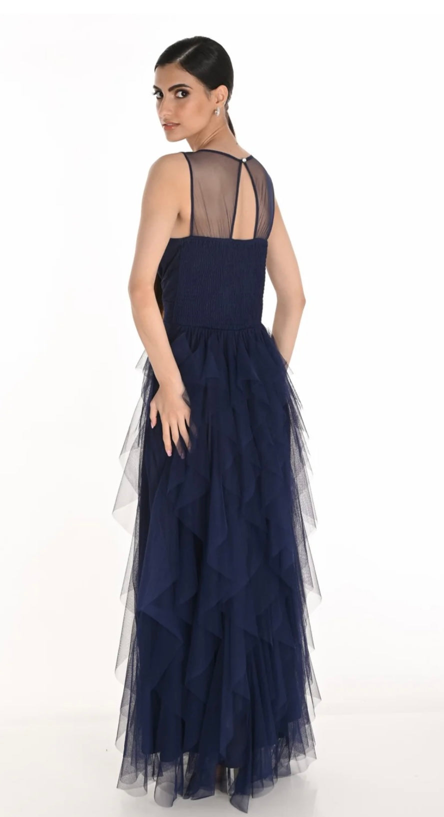 Blauwe lange jurk met een rok van ruches. De top is van tule.