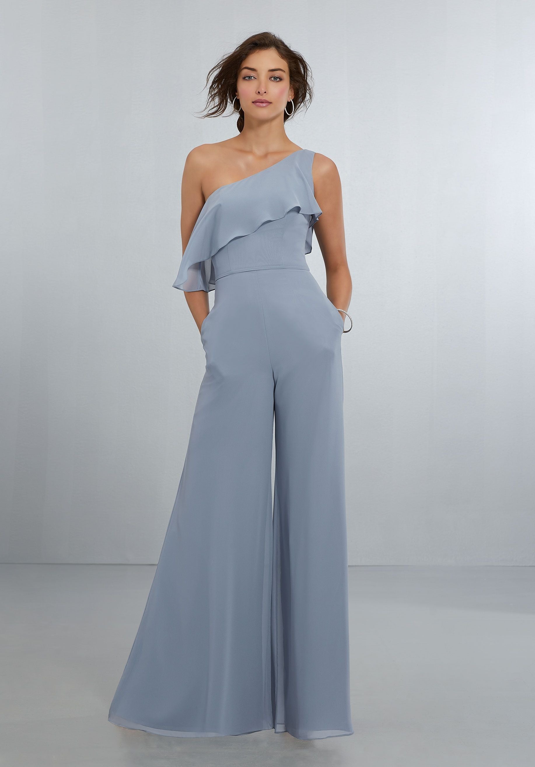 Deze jumpsuit in de kleur cornflower heeft een one shoulder top. Op de one shoulder zit een voile rand. De top is strak en daarna heeft de jumpsuit wijd uitlopende pijpen.