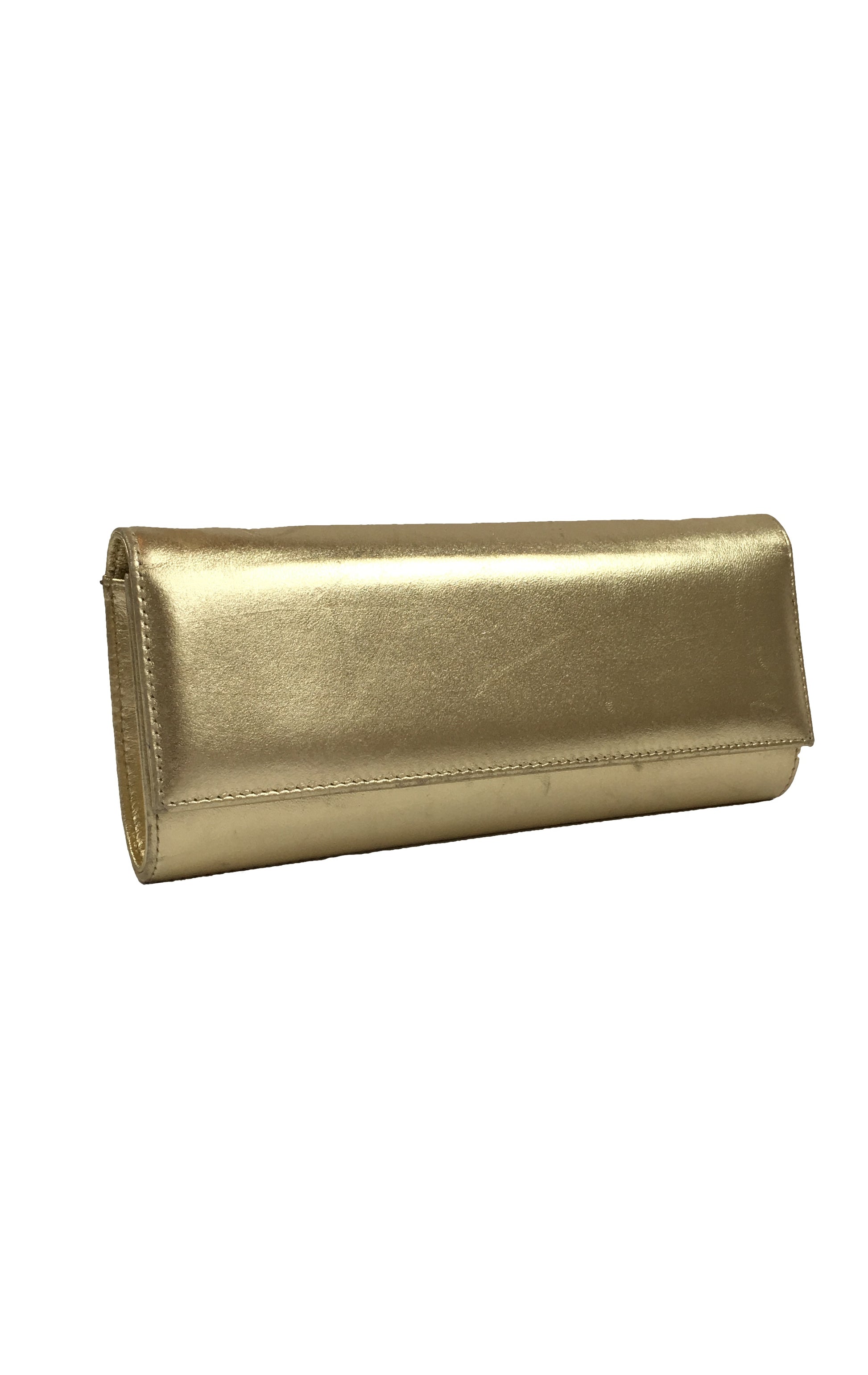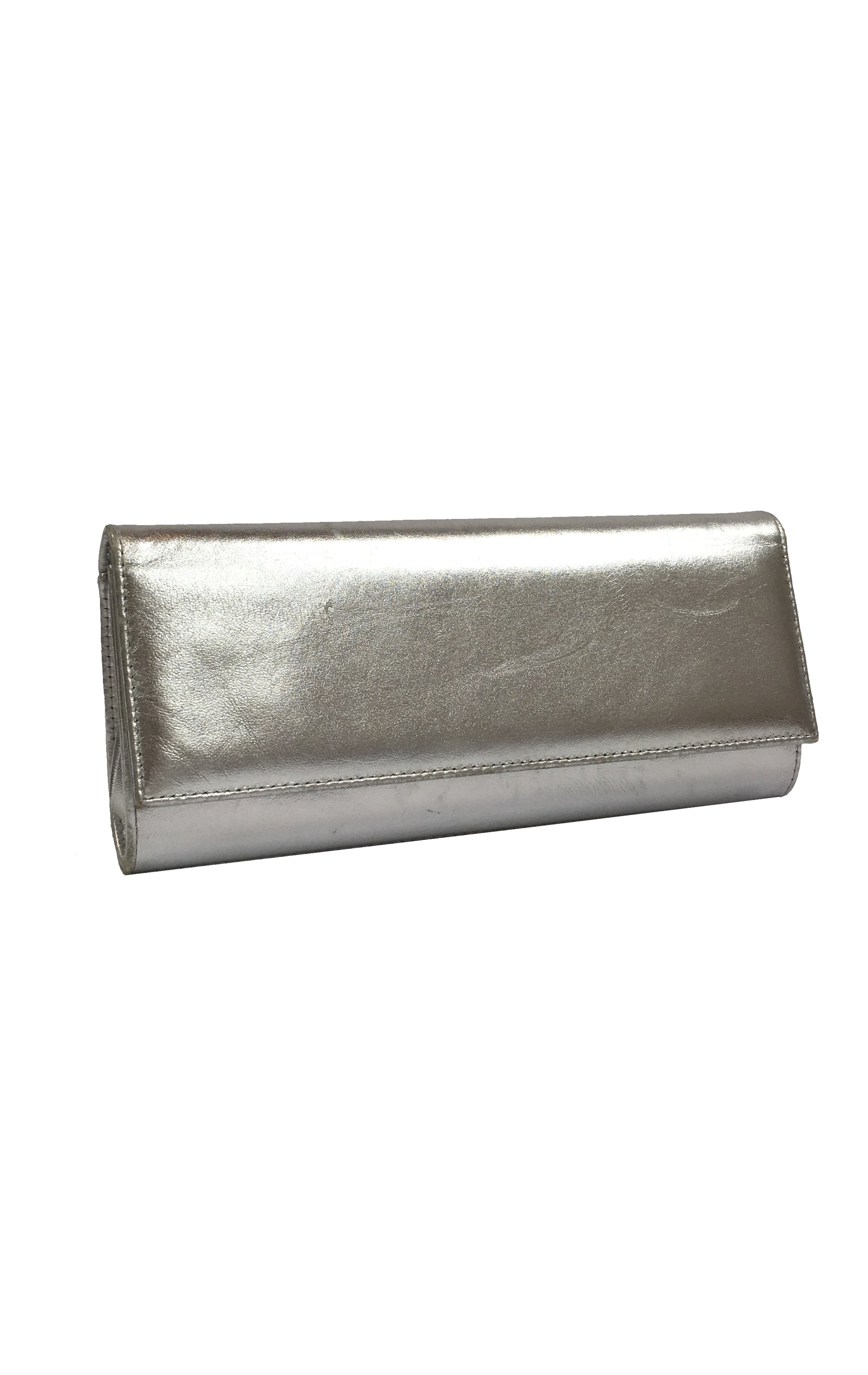 Zilveren leren clutch met hengsel. Het is ook verkrijgbaar in goudkleur.
