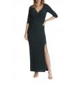 Lange jurk van een zachte stretch stof waar een glitter in verwerkt is. De jurk heeft een lange mouw en split. In de taille is het geplooid.