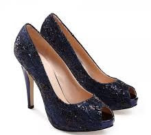 Blauwe glitterhak met open teen. De hak is 10cm hoog en de schoen heeft een plateauzool.